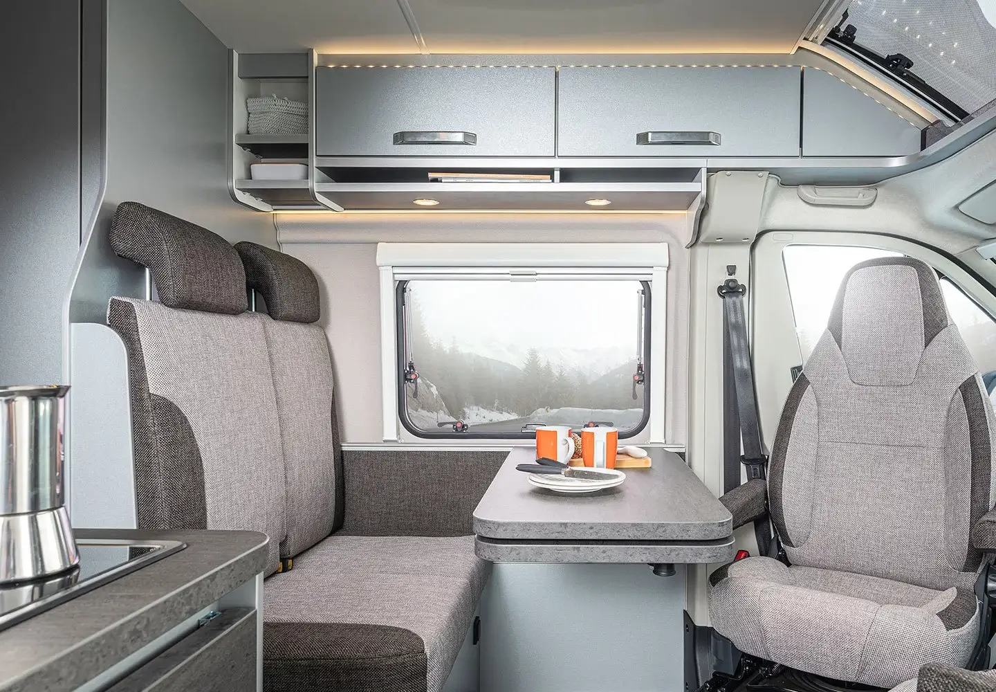 Our beautiful, complete Burstner ixeo 674 semi-integrated camper from 2010 is suitable for 4 people. This camper is 6.74 long and has 2 large width beds. A fixed bed in the back, accessible by 2 steps with lighting. Above the bed a shelf where you can put a glass and a socket to charge your mobile, this part can be shielded by a curtain. Above the seating area is a pull-down bed for 2 people.